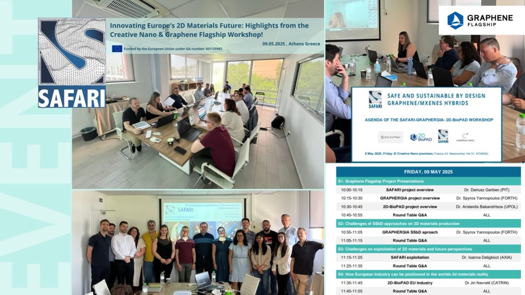 During the 8th and 9th of May 2025, our Graphene Flagship sibling project SAFARI hosted their consortium meeting in the facilities of their partner Creative Nano PC, located in Athens (Greece). SAFARI seeks to expand the range of 2D materials by leveraging graphene research while developing safety and sustainable manufacturing process, and they invited us and 2D-BioPAD to join them in a common activity.