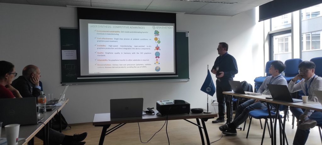 Spyros Yannopoulos and Magda Spella, from our coordinator Foundation for Research and Technology – Hellas (FORTH), participated as speakers in a collaboration workshop in which Spyros presented GRAPHERGIA and discussed about the projects’ common topics, such as challenges of SSbD (Safe and Sustainable by Design) approaches on 2D materials production, strategies for exploiting these cutting-edge materials and a look at future perspectives, and how the European industry is positioning itself as a global leader in the 2D materials landscape.