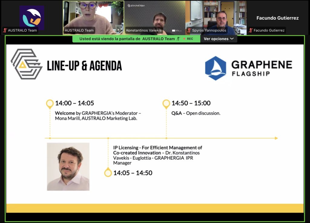 Mona Marill, the GRAPHERGIA Communication and Dissemination Manager from AUSTRALO, started the webinar welcoming the 19 participants who joined the session, giving the floor to Dr. Konstantinos Vavekis, the GRAPHERGIA IPR Manager. He offered a talk titled “IP Licensing – For Efficient Management of Co-created Innovation”. The webinar concluded with a ten-minute Q&A session and open discussion in which attendees interacted with Konstantinos to ask him their questions.
